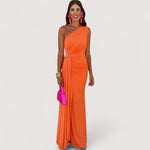 Ein One-Shoulder-Kleid mit strategischer Drapierung und einer fliessenden Passform, die die Silhouette hervorhebt. Ein raffiniertes Kleidungsstück, das für Momente entworfen wurde, in denen Stil lauter spricht als Worte.